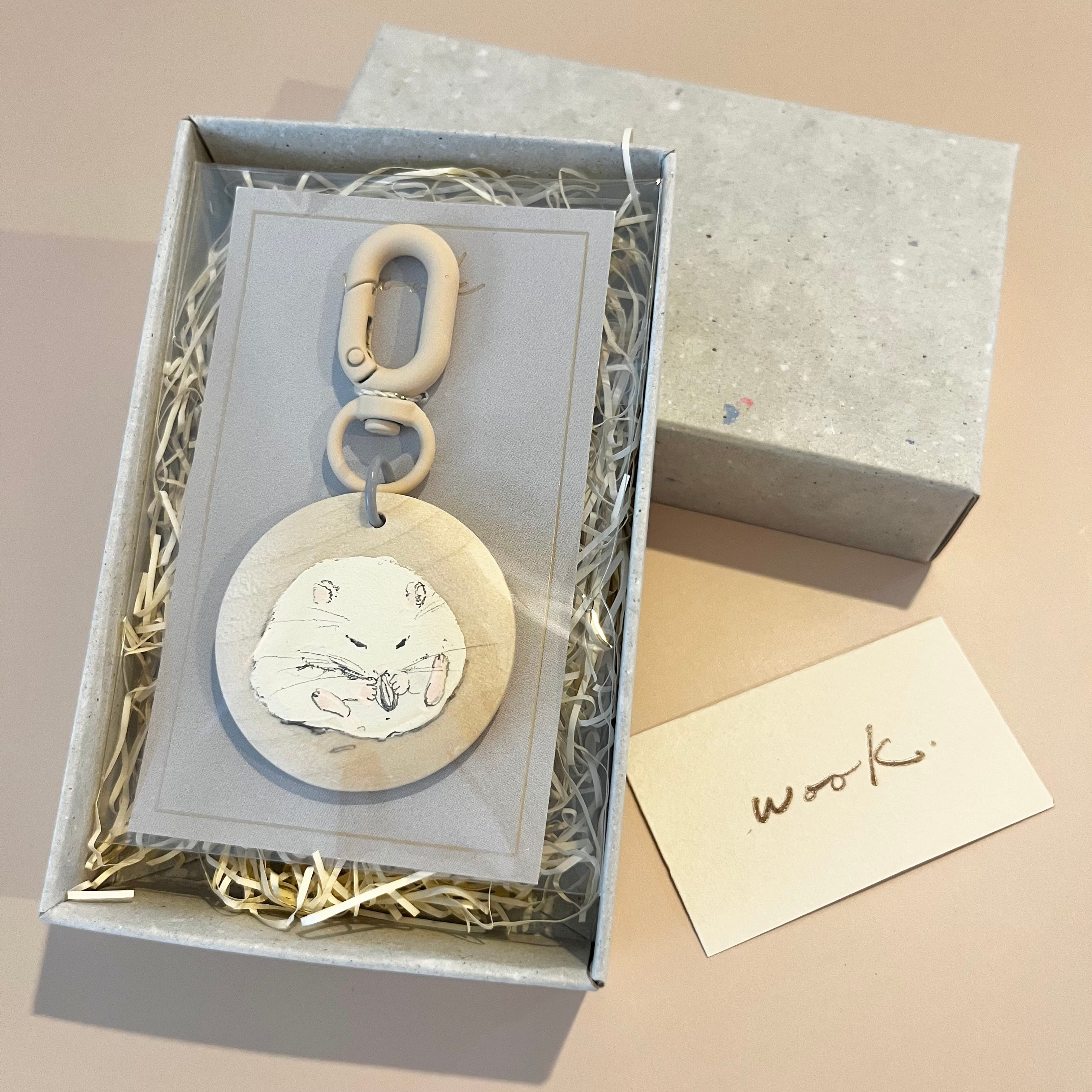 丸い木材パーツに、一つ一つ愛を込めて絵付けをしましたwook.の原画キーホルダーです。